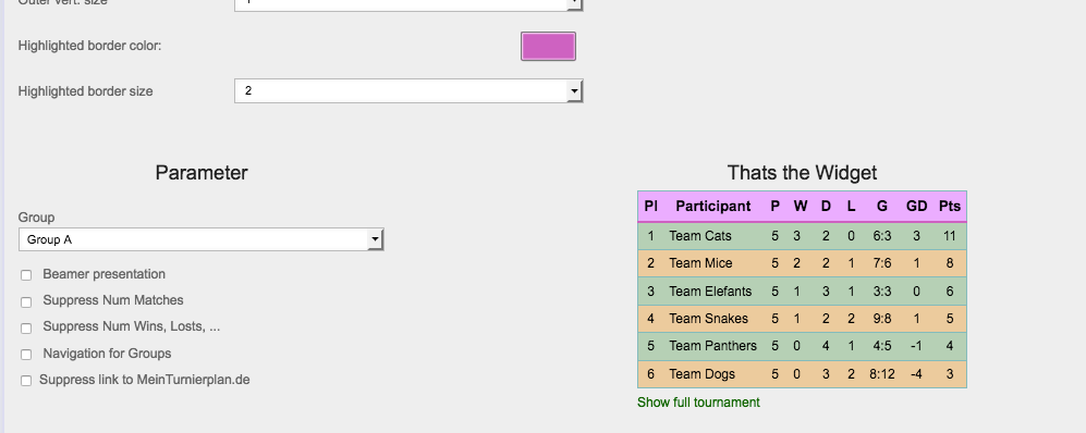- Premium – Suppress link to MeinTurnierplan.de: Below the table there's a link Show full tournament. By clicking it users are directed to the presentation page on MeinTurnierplan.de. If this option is activated the link will be hidden. This is only available if you have a premium account.